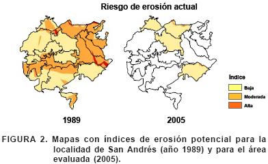 Riesgo de erosión actual de los suelos. Los índices de riesgo de erosión actual sufrieron modificaciones en el área estudiada debido a los cambios en los índices de riesgo de erosión potencial. La cubierta vegetal, que es el otro factor que influye, no sufrió cambios significativos durante los dos periodos.
