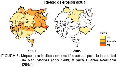 Las diferencias en los índices de erosión determinados para los periodos 1989 hasta 2005 indican que existe una tendencia a la erosión de los suelos de la localidad de San Andrés de la provincia de Pinar del Río. La variabilidad de las lluvias es un factor que ha aumentado pero no en un grado tan significativo que se refleje en los índices calculados. Sin embargo, parámetros como profundidad promedio del suelo y textura del suelo sí han cambiado de modo significativo. Estas modificaciones se reflejan en los índices de erodabilidad y riegos potenciales y actuales de erosión, que permiten verificar esta tendencia. Los aspectos del relieve y cubierta vegetal se han considerado invariables en los periodos evaluados y no tienen incidencia en los resultados obtenidos.