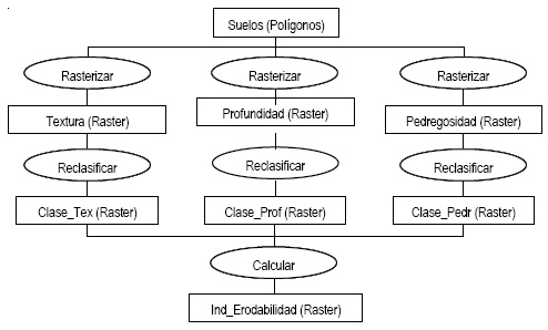 A partir de la información espacial (rasgos geográficos) y temática (tablas) de los mapas, se realizaron análisis SIG en orden de calcular los Índices de erodabilidad, riesgo de erosión actual y riesgo de erosión potencial. Al distribuir espacialmente los resultados se obtuvieron los mapas de suelos. Mediante una hoja electrónica se calcularon los índices de erosividad.