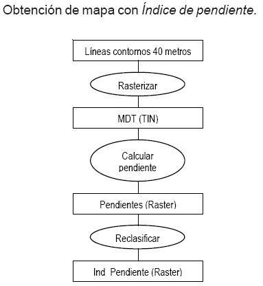 A cada punto del terreno descrito por un par de coordenadas x, y se le calcula el índice de pendiente, que es la pendiente en el punto expresada en porcentaje. Es igual a 1 (de ondulado a plano) cuando el porcentaje es menor que 5, 2 (ondulado) cuando oscila entre 5 y 15, 3 (empinado) si varía entre 15 y 30, y 4 (muy empinado) para porcentajes mayores de 30.