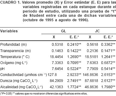 El periodo de trabajo abarcó de octubre de 1995 a agosto de 1996 y en ambos estanques se determinaron mensualmente in situ los siguientes parámetros físicos y químicos: profundidad, con una sonda; transparencia, por visibilidad al disco de Secchi; temperatura con un termómetro digital Cole Parmer; oxígeno, con un oxímetro YSI33; pH, con un potenciómetro digital Cole Parmer; conductividad, con un conductivímetro de campo Sprite; dureza y alcalinidad mediante métodos colorimétricos, según lo señalado en APHA (1998).