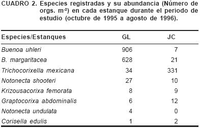 Se registraron ocho especies en el estanque GL con 1,614 organismos; de los cuales 96.6 % fueron notonéctidos y 3.03 % coríxidos. La especie Buenoa uhleri fue la más abundante (906 orgs.m2) y la menos abundante fue Corisella edulis (1 org.m2). En el estanque JC se registraron siete especies con 392 organismos, de los cuales 90.3 % fueron coríxidos y 9.69 % notonéctidos. La especie Trichocorixella mexicana fue la más abundante (331 orgs. m2) y C. edulis la menos abundante (2 orgs.m2) (Cuadro 2).