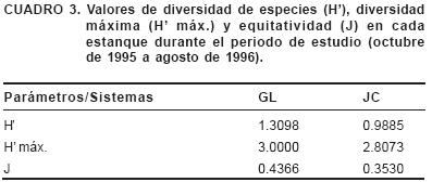 La mayor diversidad se registró en el estanque GL, así como la mayor diversidad máxima y equitatividad y la menor diversidad, diversidad máxima y equitatividad en el JC (Cuadro 3).