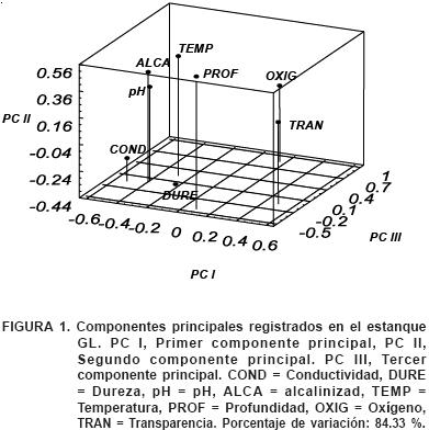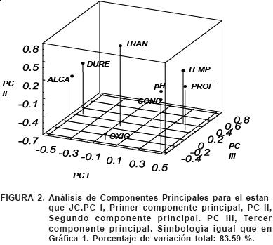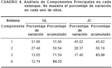 El Análisis de Componentes Principales para ambos sistemas se muestra en los Cuadros 4 y 5. En el estanque GL los cuatro primeros componentes proporcionan el 84.33 % de variabilidad, siendo la conductividad, la profundidad, el oxígeno y el pH los parámetros con mayor influencia en este sistema (Figura 1) y por lo tanto sobre la abundancia de los hemípteros registrados en este estanque. En el estanque JC son tres componentes los que proporcionan el 83.59 % de variabilidad, siendo la conductividad, la transparencia y el pH los parámetros con mayor influencia sobre la abundancia de los hemípteros en este estanque (Figura 2).