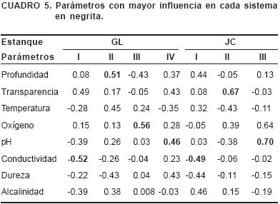 Los parámetros con mayor influencia en el estanque GL fueron la conductividad, la profundidad, el oxígeno y el pH; mientras que en el estanque JC la conductividad, la transparencia y el pH, fueron los parámetros con mayor influencia.