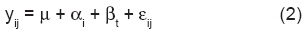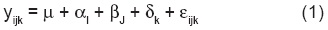 Donde yijk = la observación ijk, µ = el promedio aritmético, αi = es el efecto de las especies, βJ = es el efecto de las localidades, δk = es el efecto de los tiempos o edades de las plántulas y εij(k)= es el efecto del error aleatorio.