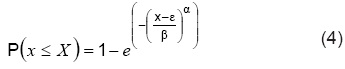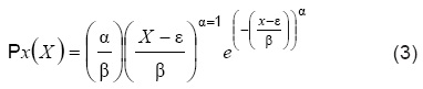 Donde px(X) = probabilidad de la variable aleatoria x, β y ε son los parámetros de forma, escala y posición respectivamente.