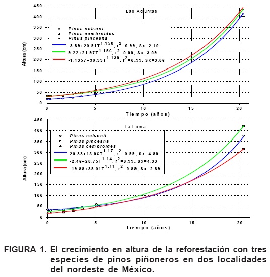 El crecimiento en altura de las tres especies para los dos sitios se reporta en la Figura 1. Las ecuaciones de predicción del crecimiento en altura mejor ajustadas fueron las funciones de potencia. Las pendientes con valores mayores que 1.0 indican que las especies se encuentran todavía acelerando su crecimiento. Los valores de las pendientes son mayores para P. pinceana y P. nelsonii que para P. cembroides. Los árboles están creciendo mejor en altura en Las Adjuntas, el sitio de menor altitud. En este sitio, la tasa de crecimiento en altura por unidad de tiempo es similar en las tres especies. Sin embargo, la tasa de inicio en el crecimiento es menor en P. nelsonii. Las especies P. cembroides y P pinceana fueron plantados inicialmente con una mayor altura, aunque no estadísticamente diferentes. Aunque P. pinceana parece crecer a una tasa menor que P. cembroides ésta alcanza una mayor altura a los 19 años de edad. Las diferencias en la altura son notorias y estadísticamente significativas entre P. pinceana, P. cembroides y P. nelsonii para todas las fechas iniciales de la plantación.