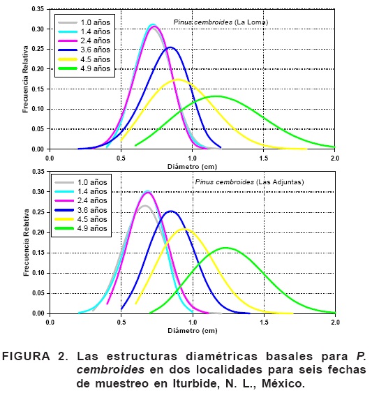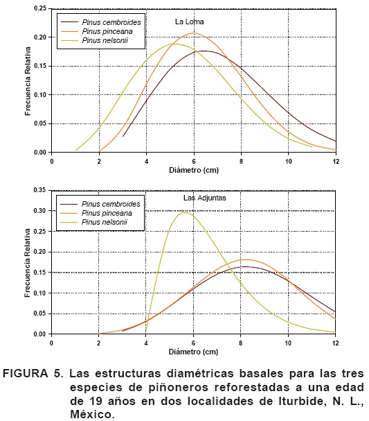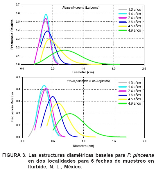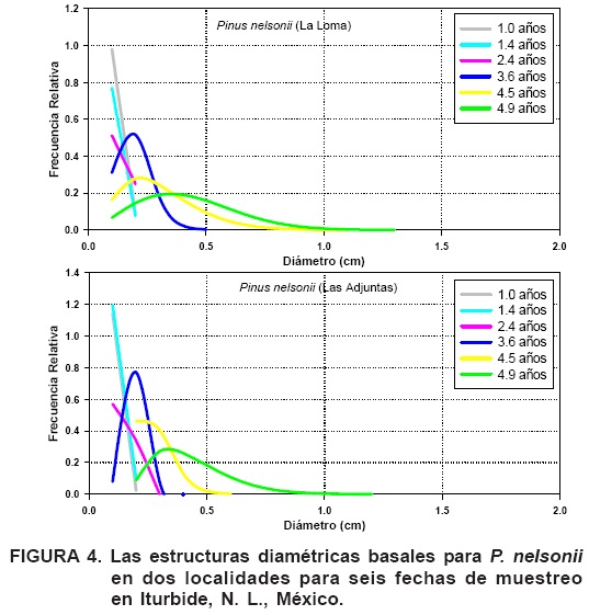 Es clara la amplia dispersión de las clases diamétricas que se observan en las tres especies de pinos piñoneros (Figuras 2, 3 y 4) y también el desplazamiento que sufren las distribuciones por el incremento en la edad. Las formas de las distribuciones, sin embargo, oscilan desde casi simétricas hasta completamente sesgadas, como es el caso de P. nelsonii en 'Las Adjuntas'.