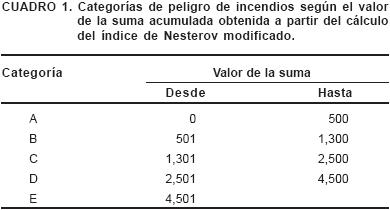 De ahí, fueron elegidos los índices de Nesterov modificado y Monte Alegre. La determinación del peligro por el primer método, el cual se utiliza hoy en Cuba, se realizó por la metodología adoptada en 1994 como resultado de investigaciones hechas por el Instituto de Investigaciones Forestales, la cual hace algunas modificaciones a la utilizada antes de ese año: