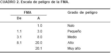 La escala de peligro de la FMA se muestra en el Cuadro 2.