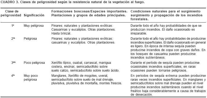 De acuerdo con Reifsnyder y Alberts (1994), los incendios forestales pueden ocurrir en casi todo tipo de vegetación en el mundo, con la posible excepción de los bosques lluviosos tropicales. En Cuba existen, según Bisse (1988), 17 formaciones forestales que van desde el nivel del mar (manglar) hasta más de 1,700 m (monte fresco), integradas en total por unas 600 especies maderables, las que por presentar algunas de ellas ciertas semejanzas en cuanto a su comportamiento ante el fuego, se agrupan en cuatro clases de peligrosidad (Cuadro 3) según Oharriz (1991). Para hacer esta clasificación los autores plantean que se debe tener en cuenta los aspectos siguientes: