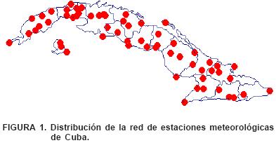Para calcular el índice de peligrosidad de ocurrencia de incendios rurales se emplearon los datos de las 1300 horas (local) de la red de estaciones meteorológicas de Cuba, 68 en total, disponibles en los servidores del Instituto de Meteorología (Figura 1).