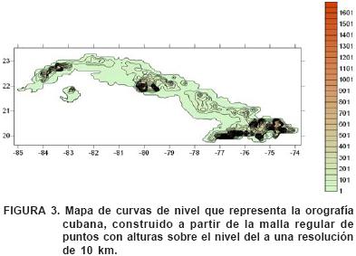 La red de estaciones de Cuba está distribuida de forma dispersa y a diferentes alturas sobre el nivel del mar, formando una malla irregular de puntos. Para aplicar el algoritmo de cálculo y ejecutar las salidas gráficas es obvio que se hace necesario convertir dicha malla en una regular, pero que a la vez tome en consideración la orografía del país. Para ello es imprescindible el empleo de métodos de interpolación objetiva, lo que obliga a reducir los valores de las variables tomadas de las estaciones meteorológicas a una altura igual para todas, para lo que se escogió el nivel medio del mar. Una vez interpoladas las variables la tarea consistiría en llevar sus valores a la altura correspondiente de cada nodo de la nueva malla regular, según datos topográficos mostrados en la Figura 3.