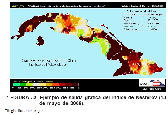 Cuba, de acuerdo con el Departamento de Ordenación Forestal del Ministerio de la Agricultura contaba al cierre de 2006 con 2,741.3 miles de ha de bosques, lo que representa el 24.9 % de la superficie del país. Sin embargo, en este mismo período se reportaron un total de 338 incendios, con 10,4327 ha afectadas; de los cuales 34 siniestros (326 ha) fueron originados naturalmente, 278 (8,550 ha) por fuentes humanas y 26 (1,560 ha) sin causas determinadas (Cuba. Cuerpo de Guardabosques, 2006). Los elementos anteriores llevan a considerar la importancia de un sistema de protección eficiente que permita reducir la ocurrencia y propagación de los incendios forestales. Actualmente, en Cuba la vigilancia del riesgo de ocurrencia de incendios rurales se basa en la combinación de varios métodos que van desde el cálculo de índices agrometeorológicos ajustados a las particulariades nacionales, hasta, el caso específico de las distintas categorías de áreas protegidas, el uso de la teledectección mediante la colaboración internacional (Brasil, Ministerio da Ciencia e Tecnología, 2008). Sin embargo, las escalas temporales de las salidas gráficas corresponden al formato decadal (diez días) (Cuba, Centro Nacional de Meteorología Agrícola, 2008), enfocadas sobre todo al diagnóstico de la situación.