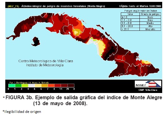 Como ejemplo de las salidas gráficas obtenidas como consecuencia del procesamiento, en las Figuras 3a y 3b se observan la evaluación de las condiciones agrometeorológicas según los índices de Nesterov y Monte Alegre. Estos análisis se distribuyen, mediante un enlace punto a punto o correo electrónico se le suministra a los interesados (dependencias del Ministerio de la Agricultura, principales tenentes del patrimonio forestal, así como el Cuerpo de Guardabosques).