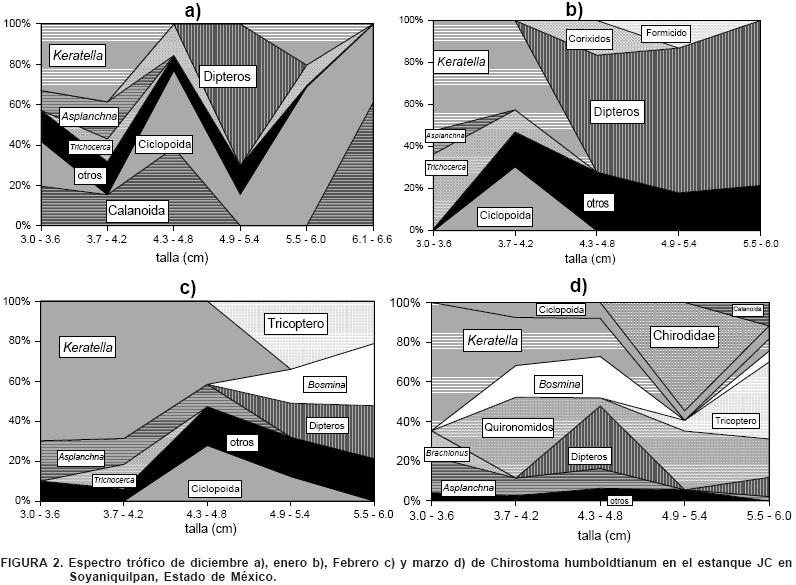 Chirostoma humboldtianum en las tallas más pequeñas (3.04.2cm) consume rotíferos principalmente Keratella, Trichocerca y Asplanchna, esto se debe a que los peces pequeños sólo pueden consumir alimento acorde al tamaño de su boca, en este caso consumen organismos del zooplancton como los ya mencionados, además, su pequeño tamaño evita que puedan huir con rapidez (Kerfoot y Peterson, 1980). El elevado consumo de zooplancton también se debe a que en el estanque al incrementar la temperatura, se ve favorecida la actividad fotosintética y con ello se incrementa la abundancia de los consumidores primarios (Wetzel, 1981).