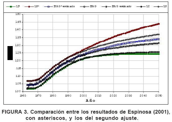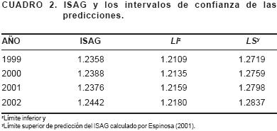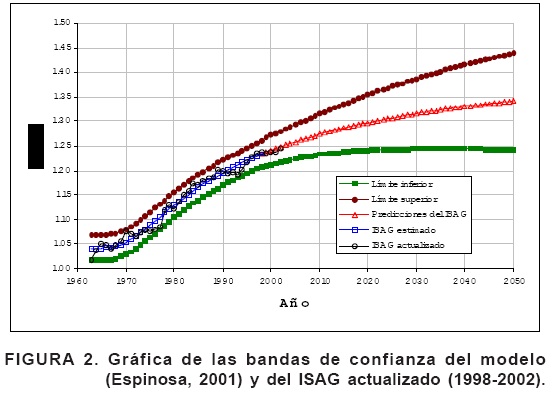 Con el propósito de observar la estabilidad del modelo (1) se agregó la información de 1999 a 2002, se volvió a ajustar, se obtuvieron las predicciones del ISAG y se calcularon sus límites de confianza y predicción hasta el 2050 (Figura 3). Las estimaciones fueron a = 1.0446, b = 0.3222, c = 46.7463, d = 1.2378 e igual CME. Los LC muestran una mejoría en la precisión de las predicciones, manifiesta en la disminución de su ancho, lo cual señala un acercamiento del modelo a la estabilidad.
