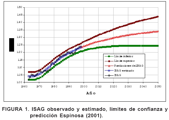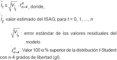 En la Figura 1 se presentan los valores del ISAG, sus estimaciones y los límites superior e inferior de confianza y predicción del índice.