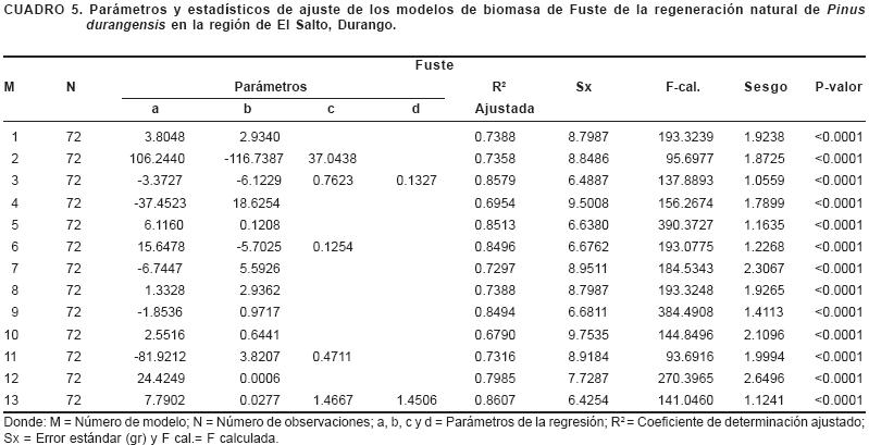 De los 13 modelos probados para estimar biomasa en los componentes hojas, ramas, fuste y total de la regeneración natural de P. durangensis, se observa que los modelos se ajustaron mejor al componente de biomasa total, seguido por la biomasa en el fuste, en las hojas y finalmente el componente de las ramas (Cuadro 3).