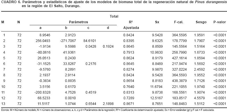 Para la estimación de biomasa total en la regeneración natural de P. durangensis, el modelo 3 mostró mejor ajuste de acuerdo a los criterios estadísticos de selección, por presentar una R2 de 0.8645, un error de 8.8509 y un menor sesgo de (1.5164) (Cuadro 6).