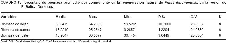 Los porcentajes de biomasa promedio en regeneración natural de P. durangensis, muestran que a edades entre 3 y 10 años, el fuste aporta 46.9 % de la biomasa, las hojas 35.6 % y las ramas solamente 17.3 % de la biomasa total.