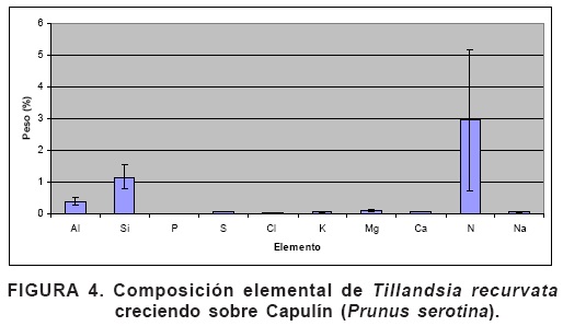 La única especie, de las analizadas, que presentó sodio (Na) en su composición fue Tillandsia, esto resulta sorprendente dado que la mayoría de las plantas excretan este ión, aunque se ha encontrado que las que tienen fotosíntesis tipo C4 requieren de sodio (Ohta et al., 1987).
