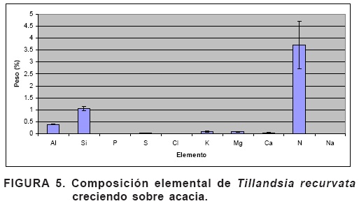 El silicio se presenta de manera importante en Tillandsia recurvata, con más de 1 %. Hodson et al. (2005) mencionan valores de 0.256 % para Tillandsia usneoides. Sería interesante hacer análisis elemental de más especies dentro del género y abarcar diferentes regiones geográficas, de ampliar y ahondar en este género respecto a su contenido de silicio. Las Figuras 4 y 5 muestran que la composición de la planta se mantiene constante tanto al crecer sobre acacia como al crecer sobre capulín. En la calabaza (Cucurbita sp.) y el arroz, se sabe que hay un loci que interviene en la acumulación de silicio (Piperno et al., 2002; Wu et al., 2006). Entre las plantas acumuladoras de silicio se halla el arroz, que alcanza 6 % y se ha convertido en uno de los modelos para estudiar la acumulación y el papel del silicio en los vegetales; además los fitosilicatos se encuentran entre los principales componentes del suelo que interaccionan con la materia orgánica (HoghJensen et al., 2001; Ma y Yamaji, 2006). Es probable que Tillandsia pueda servir como un modelo alternativo para estudiar la absorción y transporte de silicio.