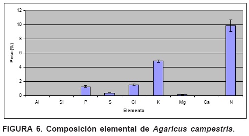 En plantas, el porcentaje de calcio y magnesio oscila entre 0.0213.1 % para el primero y de 0.033.2 % para el segundo (Broadley et al., 2008). La cantidad de fósforo conocida varía de entre 0.150.5 %; vale la pena mencionar que el champiñón (Figura 6), un hongo, presenta una alta acumulación de este elemento. Si la alta concentración de fósforo se debe al tipo de sustrato usado para el cultivo es algo que se ignora todavía, y que es importante considerar por ser también una especie comestible; en su forma de micorriza facilita a las plantas la adquisición de algunos nutrimentos como el fósforo y el potasio. De acuerdo con los resultados obtenidos en el presente estudio, estos hongos son capaces de almacenar cierta cantidad de nutrimentos, como el fósforo, en su cuerpo fructífero. Los valores que encontramos para las plantas caen dentro de los valores citados (Epstein, 1994; Broadley et al., 2008). La concentración de azufre mencionada en otros estudios (Epstein, 1994) oscila entre 0.11.5 %, intervalo dentro del cual caen los valores obtenidos en este trabajo. En el caso del potasio, de importancia como osmolito para las plantas y también desde el punto de vista de nutrición humana, se indican valores de 0.88 % (Epstein, 1994). Los resultados muestran que Struthantus quercicola (correhuela) alcanza un valor de 1.1 %, el champiñón de 4.85 % y Cuscuta (Figura 7) de 0.32 %; la correhuela y la Cuscuta se sabe que usan el potasio como osmolito, a fin de atraer el flujo de savia de las plantas que parasitan, hacia sus propios tejidos, por ello presentan concentraciones considerables de este ión.