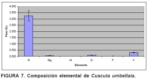 Para la Cuscuta se mencionan valores de acumulación de silicio de entre 0 y 0.63 % (Hodson et al., 2005), intervalo dentro del cual se encuentran los hallados en el presente estudio (0.09 %, Figura 7). Para Cyperus se encontró un valor de 0.26 %; se han registrado valores desde 3.42 % para Cyperus alternifolius hasta 0.79 % para C. alopecuroides (Hodson et al., 2005) El valor determinado fue menor y amplía el intervalo en cuanto al contenido de silicio en este género.