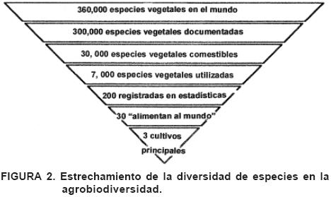 Se estima que existen alrededor de 360,000 especies vegetales, de las cuales sólo se tiene registro de unas 300,000 especies. El 10 % e. 30,000) de estas plantas son comestibles y alrededor de 7,000 han sido cultivadas o colectadas por el hombre como alimento o para otros propósitos agrícolas en alguna época (Williams, 1993). Las estadísticas de producción mencionan aproximadamente 200 especies de plantas cultivadas, pero solamente 30 de estos cultivos "alimentan al mundo", esto es, proporcionan en conjunto 95 % de energía en la dieta o proteína. Sólo tres cultivos, arroz (26 %), trigo (23 %) y maíz (7 %) proporcionan más del 50 % del abastecimiento energético del alimento global, derivado de los cultivos (FAO, 1995; Hawkes, 1991; Alcorn, 1984), (Muñoz, 2004).