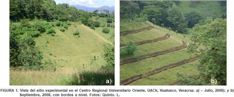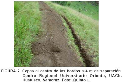 Una vez señaladas las curvas de nivel se construyeron cinco zanjasbordos, las cuatro primeras (contando de la parte más alta a la más baja del sitio) a 7 m de separación y la quinta a 8 m; las longitudes fueron de 80.5 y 86.6 m, para las primeras cuatro y quinta, respectivamente. Las zanjas fueron de 50 cm de ancho y 1 m de profundidad con respecto del nivel del suelo de la pared más alta de la zanja.