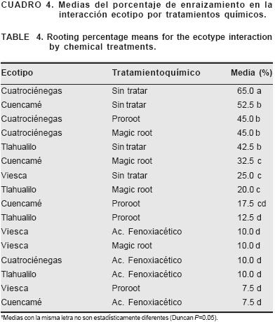 La comparación de medias de la interacción entre ecotipos y tratamientos químicos, indica que Cuatrociénegas sin tratar mostró el porcentaje de estacas enraizadas más alto (Cuadro 4). Le siguieron en orden descendente las combinaciones Cuencamé sin tratar, Cuatrociénegas con proroot, Cuatrociénegas con magic root y Tlahualilo sin tratar, las cuales no fueron estadísticamente diferentes entre ellas (P=0.05) y tuvieron en promedio un 46 % de enraizamiento que representa el 71 % de la mejor combinación. En seguida Cuencamé con magic root, Viesca sin tratar y Tlahualilo con magic root mostraron un 26 % en promedio de enraizamiento que representa el 40 % de la mejor combinación y por último el grupo de Cuencamé, Tlahualilo y Viesca con proroot, Viesca, Cuatrociénegas, Tlahualio y Cuencamé con ácido fenoxiacético y Viesca con magic root con un enraizamiento promedio del 11 % que constituye el 16 % de la mejor combinación.