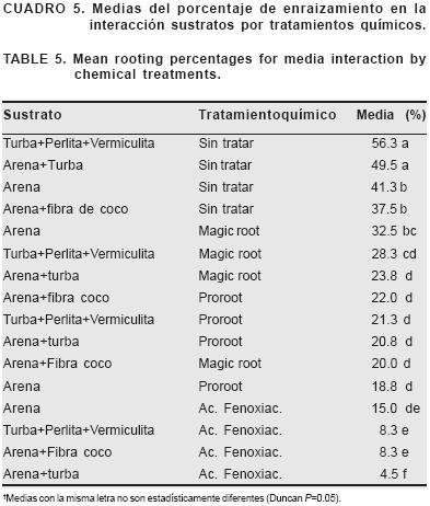 La interacción entre el sustrato y tratamiento químico indica que las mezclas de turba con perlita y vermiculita y la de arena con turba sin tratamiento químico mostraron el porcentaje de enraizamiento más alto, con un promedio del 53 % (Cuadro 5). Les siguieron la arena y la mezcla de arena con fibra de coco sin tratar, con un promedio del 39 % de enraizamiento. La arena y la mezcla de turba con perlita y vermiculita con magic root produjeron en promedio un 30 % de estacas enraizadas. Las mezclas de arena con turba y con fibra de coco con magic root y los cuatro sustratos con proroot promovieron en promedio un 21 % de enraizamiento. El grupo de arena, turba con perlita y vermiculita y arena con fibra de coco combinados con ácido fenoxiacético mostraron un 10 % en promedio de enraizamiento y por último la mezcla de arena con turba con sólo el 8 % del enraizamiento producido en las dos mejores combinaciones.