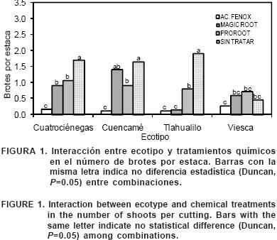 La emisión de brotes por estaca en las combinaciones de Cuatrociénegas, Cuencamé y Tlahualilo sin tratar y en Cuencamé con magic root, fue estadísticamente similar (P=0.05) y superior a la observada en el resto de las combinaciones (Figura 1). El promedio de brotes por estacas en esos tratamientos fue de 1.7 y fue mayor en un 83 % al promedio registrado en las combinaciones de Cuatrociénegas con magic root y proroot, Cuencamé y Tlahualilo con proroot, y en un 183 % al del promedio de Viesca sin tratar y con magic root y proroot. Los cuatro ecotipos combinados con ácido fenoxiacético y Tlahualilo con magic root mostraron la menor brotación de estacas con apenas 10 % de la registrada en las mejores combinaciones.