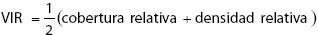 donde π = 3.1416, d1 y d2 son los diámetros mayor y menor perpendiculares entre sí de la proyección vertical de la copa del arbusto o cobertura de las herbáceas. El VIR para árboles se calculó con la fórmula: