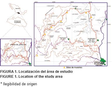 Área de estudio. El Cañón del Zopilote tiene una extensión de 738 km2 y coordenadas extremas: 17°39'42", 18°03'59" latitud norte y 99°31'01", 99°46'35" de longitud oeste, se localiza en la cuenca del río Balsas, en el estado de Guerrero (Figura 1). Comprende los municipios de Eduardo Neri, Leonardo Bravo, Tepecoacuilco, Chilpancingo, Tixtla y Cocula (Peralta, 1995). El trabajo de investigación se realizó a lo largo de un gradiente altitudinal que comprende desde 450 m, en el Cañón del Zopilote, hasta los 2,800 m de altitud, en la comunidad de Carrizal de Bravo. La topografía del lugar está formada por cerros y laderas con pendientes pronunciadas y barrancas profundas. Con respecto a la hidrografía, se localiza el río el Zopilote el cual recibe las corrientes de los ríos Coloapán y Huacapán, que descienden de la región sur oriental y fluyen sólo en la época de lluvias (INEGI, 1984).