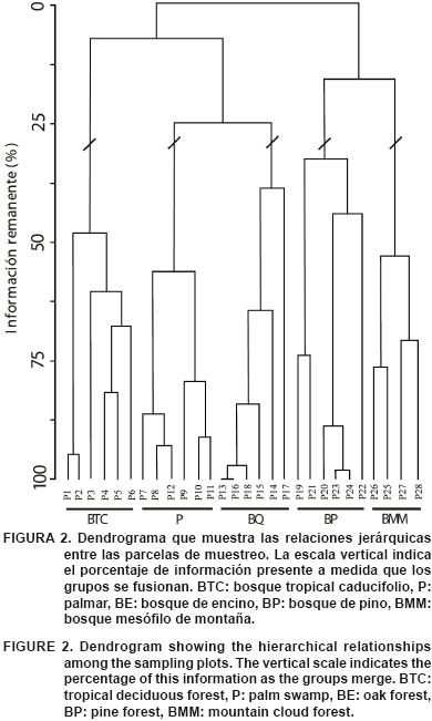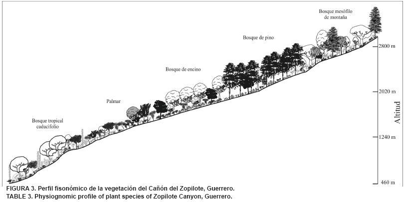 En el presente estudio, el análisis de agrupamiento permitió distinguir cinco tipos de vegetación en el Cañón del Zopilote (Figura 2), que corresponden a los patrones fisonómicos observados a lo largo del gradiente altitudinal: 1) bosque tropical caducifolio, localizado en el intervalo de altitud de entre 450 y 1,200 m, 2) Palmar entre 1,100 y 1,700 m, 3) bosque de Quercus, distribuido en el intervalo de entre 1,700 y 2,000 m, 4) bosque de Pinus, entre 2,000 y 2,500 m y 5) bosque mesófilo de montaña, entre 2,500 y 3,000 m.