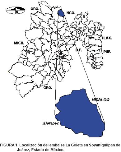 El embalse La Goleta se localiza en el municipio de Soyaniquilpan de Juárez, al noroeste del Estado de México (Figura 1). Este cuerpo de agua se localiza en el Eje Neovolcánico y pertenece a la subcuenca del Alto Pánuco. Sus coordenadas son: 20° 03' 54" y 20° 04' 28" de latitud norte y 99° 33' 05" y 99° 31' 48" de longitud oeste, con una altitud de 2,460 m (CETENAL, 1989). El suministro principal del embalse es la precipitación pluvial y tres arroyos de corriente intermitente: el arroyo "El Paye" se sitúa al noroeste, el arroyo el "El Grande" al suroeste y el arroyo "El Muite" al sureste. El clima del lugar según Köppen modificado por García (1988) es Cb (wl) (w) (i)' g que se define como templado con verano fresco largo con una temperatura media anual de 15.6 °C, es subhúmedo con régimen de lluvias de verano, con una precipitación media anual de 749.5 mm concentrada en un 72.3 % de junio a septiembre y con un 4 % de precipitación en invierno.
