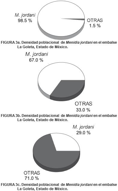 En la Figura 2 se presenta la abundancia de M. jordani en los períodos de estudio, destacando la abundancia elevada en 1998. En las Figuras 3 ac, se muestran los porcentajes de la abundancia de M. jordani con relación al resto de las especies. En 1998 además de M. jordani estuvieron presentes: Cyprinus carpio y Girardinichthys multiradiatus; en 2007: C. carpio y Carassius auratus y para el 2008: C. carpio, C. auratus y Micropterus salmoides.