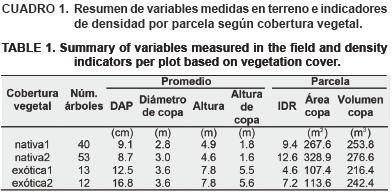 En el Cuadro 1 se presenta la información obtenida en las cuatro parcelas, donde se observa que la cobertura nativa tiene un menor desarrollo en diámetro y altura que la cobertura exótica, a nivel de cada árbol.