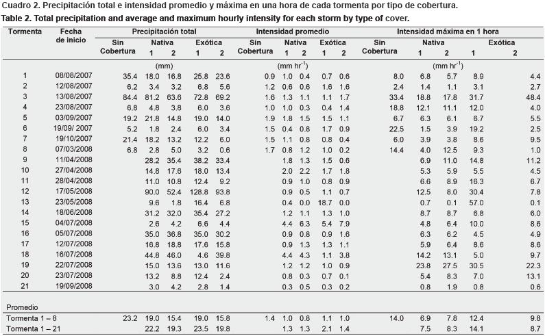Para los pluviógrafos con cobertura vegetal es posible indicar que la cobertura exotica1, que presenta el mayor valor global de precipitación, tuvo un 62 % de las tormentas con valores máximos de precipitación total. Incluso en tres ocasiones superó el registro del pluviógrafo sin cobertura vegetal, cuya posible explicación resulta del "efecto embudo", debido a la conformación de las copas y a la distribución del rodal, en donde, las precipitaciones entran con mayor facilidad al instrumento de medición sin una mayor interceptación. La cobertura nativa2, que presenta el menor valor global de precipitación, solo en 24 % de las tormentas presentó valores mínimos de precipitación total.