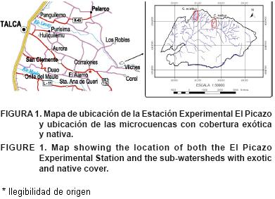 Antecedentes de la zona de estudio: En la Estación Experimental El Picazo perteneciente a la Universidad de Talca, emplazada en la precordillera1 andina de la región del Maule, Chile, fueron seleccionadas dos microcuencas de aproximadamente 4 hectáreas, con diferente cobertura vegetal (Figura 1). La cobertura nativa corresponde a un bosque secundario del tipo forestal Roble Hualo, donde las especies predominantes son Nothofagus obliqua y Nothofagus glauca, en tanto la exótica corresponde a una plantación de Pinus radiata D. Don con 12 años de edad.