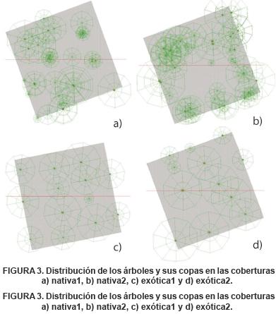 El mayor número de árboles de las coberturas nativas da origen a indicadores de densidad superiores a las coberturas exóticas, de modo que se podría pensar de manera anticipada que las coberturas nativas tienen mayor potencial de intercepción del agua de lluvias. Por ejemplo, la cobertura con mayor área de copa, 328.8 m2, es la cobertura nativa2, lo cual haría pensar que la parcela que mide 100 m2 está tres veces cubierta por la vegetación nativa. Sin embargo, las Figuras 3a y 3b muestran la distribución de los árboles de la cobertura nativa, donde se aprecia gran superposición de copa, lo cual ocurre de forma menos evidente en las coberturas exóticas (Figura 3c y 3d). Además, hay que agregar que en las coberturas nativa1 y nativa2 se presenta un 33 y 5 % respectivamente, de árboles de hoja caduca (Nothofagus glauca), de modo que en otoño e invierno disminuye la capacidad de intercepción del agua de lluvia.