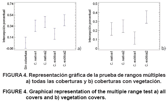 Las coberturas nativas no presentaron diferencias estadísticamente significativas en la intercepción porcentual promedio, 35 y 41 %. Estas coberturas presentan los mayores indicadores de densidad, sin embargo, la intercepción porcentual, se encuentra en rangos intermedios.