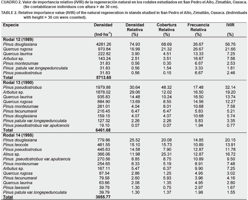 En los Cuadros 2 y 3, se presentan el de Valor de Importancia Relativo (IVIR) de las especies registradas en las áreas de regeneración natural y en los rodales adyacentes. El mayor IVIR en cada rodal lo presentan las especies de pino seguido de las latifoliadas. En ambos casos la mayor contribución al valor de importancia está constituida por la densidad y la cobertura. En el rodal 12, la diferencia entre la especie con mayor IVIR es muy marcada en relación al resto de las especies, esta situación no se presenta en los rodales 13 y 14 (Cuadro 2).