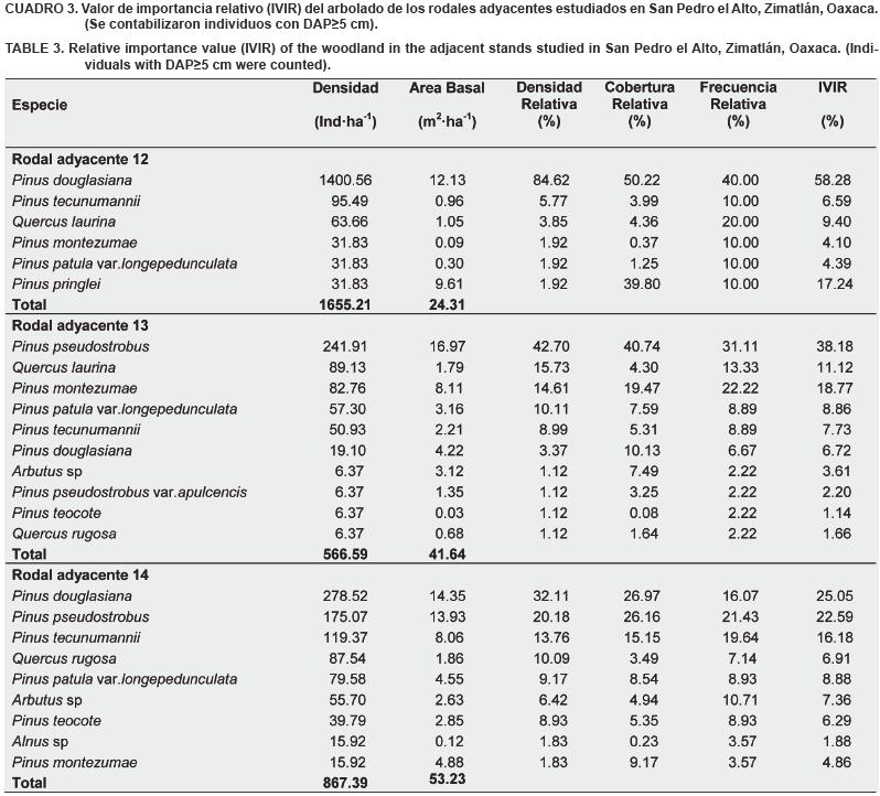 La riqueza de especies del arbolado de los rodales adyacentes (seis, diez y nueve especies, respectivamente) y sus valores de densidad (Cuadro 3), muestran una tendencia similar a los valores encontrados en las áreas de regeneración. En los rodales adyacentes 12 y 14, P. douglasiana es la especie dominante, mientras que en el rodal 13 la especie dominante es P. pseudostrobus. También existen especies que estando presentes en éstos, no lo están en las áreas de regeneración. Por ejemplo, P. pringlei está presente en el rodal adyacente 12 con una densidad de 32 individuos ha1 y un área basal de 9.6 m2·ha1, lo que indica que se trata de árboles grandes. Sin embargo, no se registró ningún individuo de esta especie en las áreas de regeneración. Lo mismo ocurre con P. teocote Schl. Et Cham. en el rodal 13.