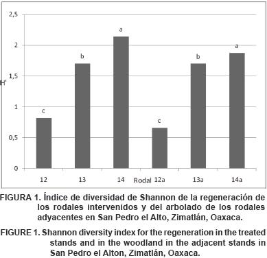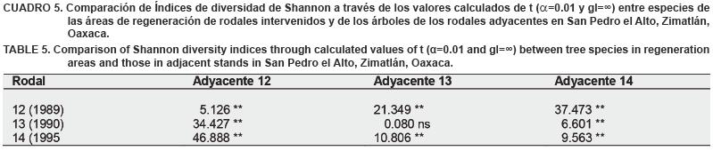 Al comparar los valores de t calculados para el índice de Shannon entre las áreas de regeneración y de las adyacentes (Cuadro 5), se encontró que solamente el índice de diversidad del rodal 13 y de su rodal adyacente no son estadísticamente diferentes, y en todas las demás comparaciones los rodales son diferentes en cuanto a diversidad.