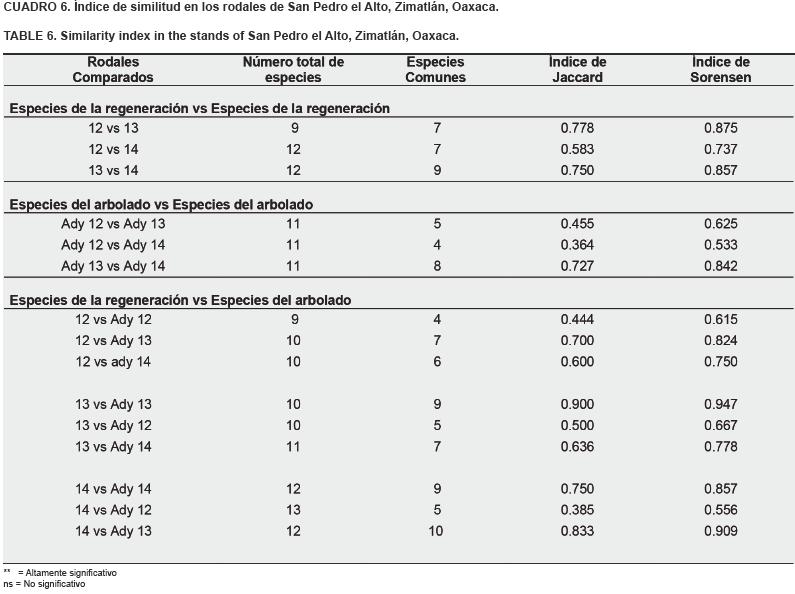 Al comparar las especies de los rodales de regeneración con el arbolado, el rodal 13 con su respectivo adyacente presentaron el mayor valor del índice de Jaccard (0.900) y Sorensen (0.947), resultados similares para estos rodales se obtuvieron con el índice de Shannon (Cuadro 5).