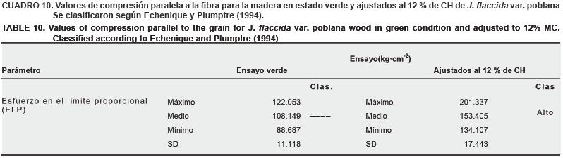 El esfuerzo de compresión perpendicular a la fibra tiene su aplicación si la madera de esta especie va a ser utilizada como soporte, donde esté sujeta a cargas externas que tiendan a compactarla, por ejemplo para durmientes. Los resultados expresados en el Cuadro 10 indican que la madera de J. flaccida var. poblana es aceptable para este uso.